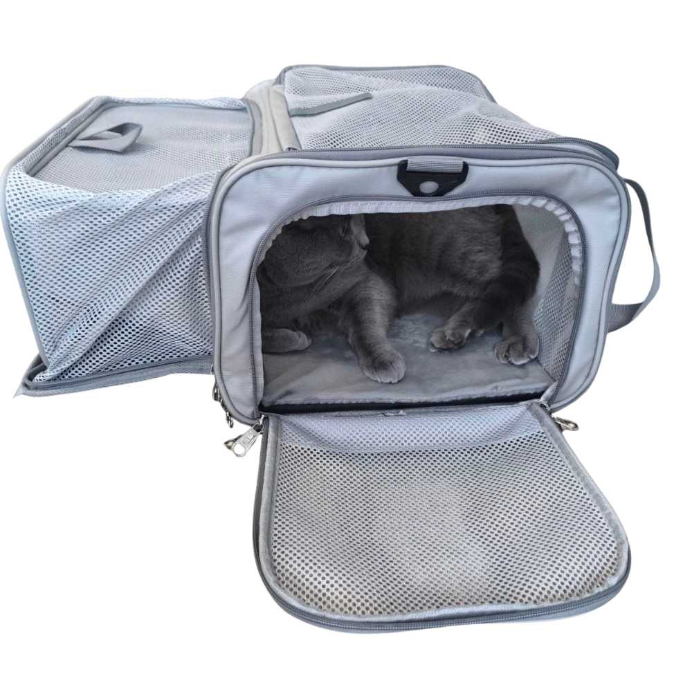 Airline-approved by Transavia, Ventora pet carrier (40L x 30W x 24H cm) fits under the cabin seat and features top and side entry, an expandable resting area, built-in leash, and mesh top for naps on the go.